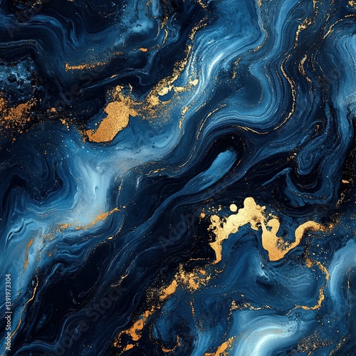 Abstract liquid marble texture, dynamic blue and gold swirl pattern, high contrast glossy surface, luxury and elegant design style.