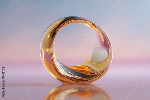 abstract luminous 3d circular form with glossy gold and iridescent reflections floating on pastel gradient concept of product display template for branding banner and digital design