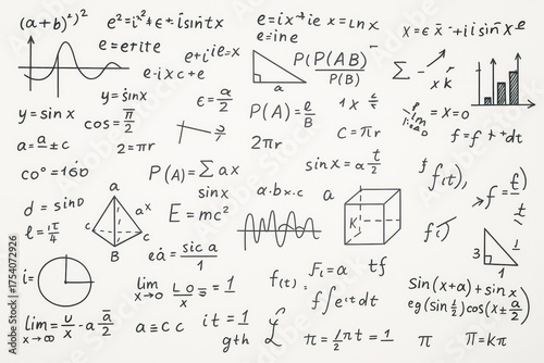 Abstract mathematical formulas and scientific equations hand-drawn in black ink on white background, symbolizing science and education concepts.