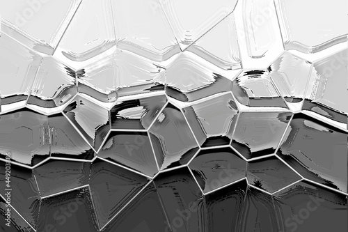 Abstract metal texture. Background with hexagons. Stylish web image for creative design of layout. Black backdrop and light gray pattern. Cool simple art deco.