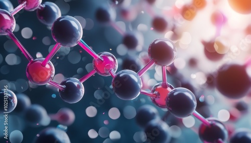 Abstract molecular structure with vibrant colors and bokeh effect showcasing scientific innovation and research.