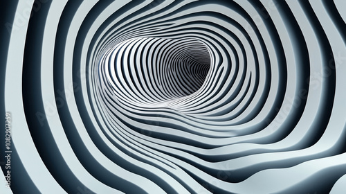 Abstract monochrome tunnel with wavy layered stripes creating a sense of depth and movement, evoking an optical illusion effect in grayscale tones.