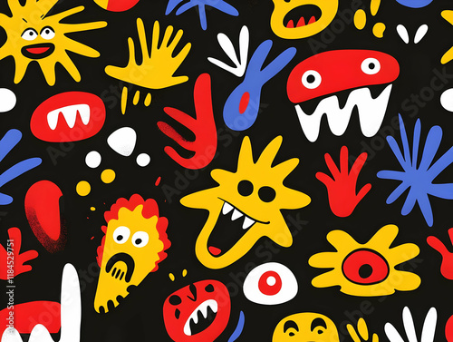abstract, illustration, background, monster, colourful, playful, cartoon, whimsical, fun, design, pattern, seamless, texture, vibrant, graphic, art, vector, image, artwork, digital, print, textile, wallpaper, surface, decoration, style, bright, happy, creative, bold, modern, contemporary, fantasy, cute, funny, quirky, unique, imaginative, expressive, abstract background