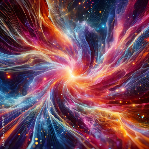 Abstract multi-coloured galaxy image with stars and exploding tendrils