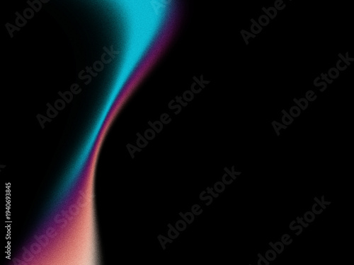 Abstract neon gradient light curve on black background with grain texture, futuristic glowing wave design