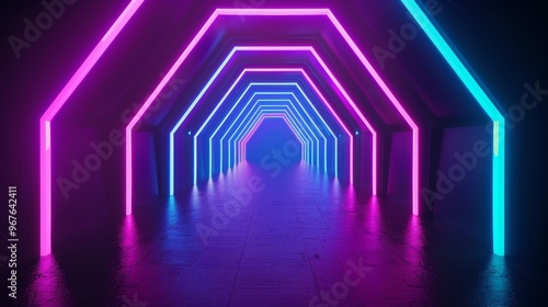 Abstract neon light tunnel with pink and blue glowing lines. Futuristic background with glowing lines and reflections.