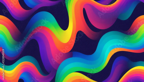 Abstract neon shapes in vibrant rainbow colors over a grainy noise texture with soft glowing effects.
