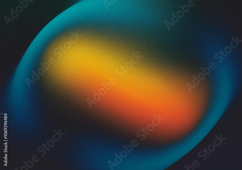 Abstract noisy background, yellow orange blue glowing color shape, grainy dark noise texture, copy space