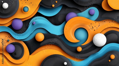 abstract, background, design, texture, pattern, wave, curve, orange, blue, black, paper, cut, style, three-dimensional, illustration, art, graphic, modern, contemporary, vibrant, colourful, dynamic, energy, movement, shape, circle, sphere, geometric, wallpaper, creative