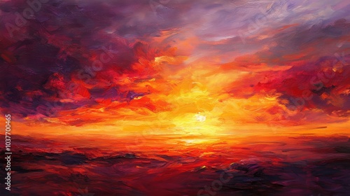 sunset, cloud, sky, orange, red, yellow, art, painting, abstract, landscape, horizon, nature, evening, gold, fiery, warm, vibrant, dramatic, texture, stroke, high-coloured, colours, impressionism, oil, canvas, glow, light