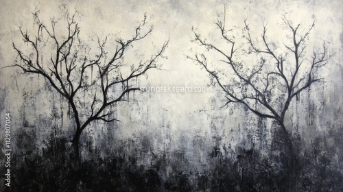 painting, abstract, tree, bare, branch, fog, mist, winter, landscape, art, artwork, canvas, monochrome, grey, black, white, textured, background, nature, scenery, atmosphere, moody, sombre, desolate, cold, stark, minimalist, simple, elegant, serene, peaceful, quiet, still, calm, dark, light, contrast, shadow, depth, perspective, acrylic, texture, shades, tone