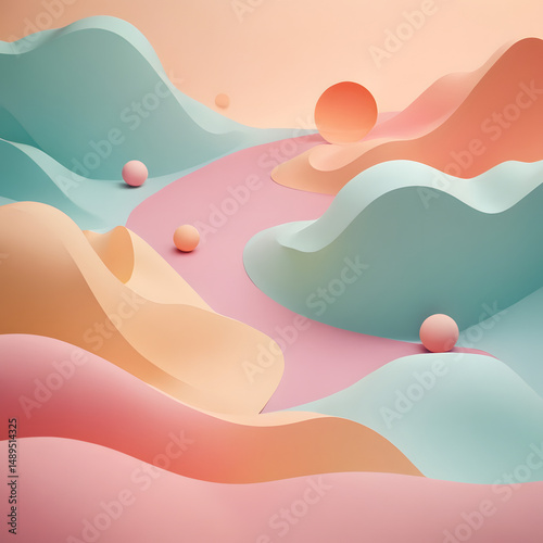 Abstract Pastel Landscape Soft Hills, Gentle Curves, and Floating Spheres