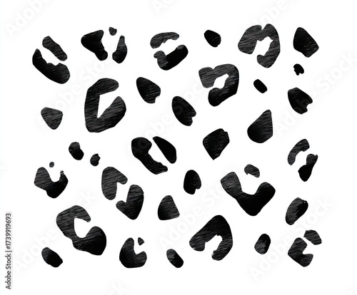 Abstract pattern of black spots resembling animal print, scattered on white background