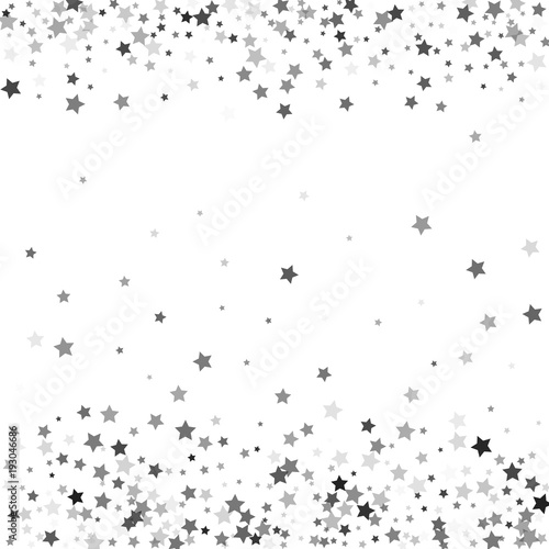 Abstract pattern of random falling silver stars on white background. Glitter template for banner, greeting, Christmas and New Year card, invitation, postcard, paper packaging. Vector