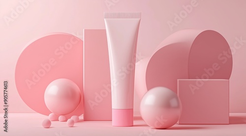 Abstract pink background with a cosmetic tube mockup and spheres.