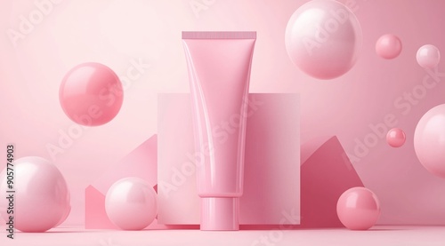 Abstract pink background with a cosmetic tube mockup and spheres.
