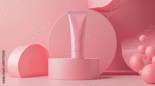 Abstract pink background with a cosmetic tube mockup and spheres.