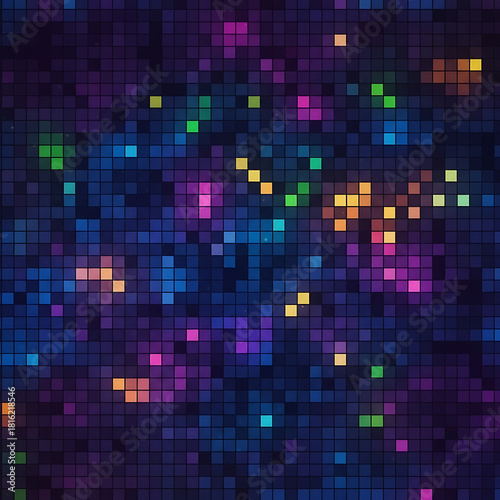 Abstract pixelated background with colorful bokeh lights and geometric patterns