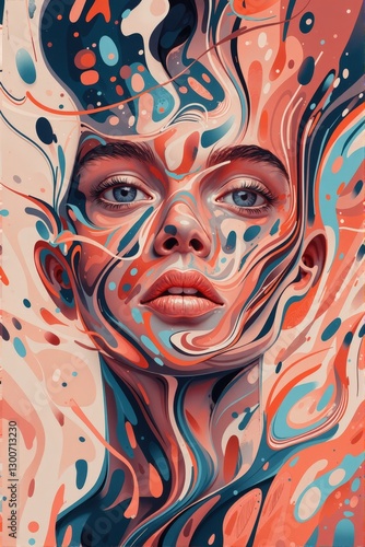 Abstract portrait of a young woman with vibrant colors and fluid shapes. Perfect for fashion, beauty, or art-related projects.