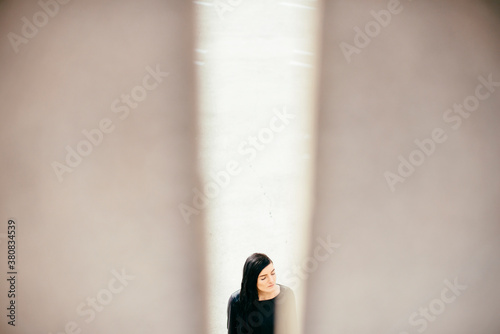 urban, trendy, stylish, simple, portrait, pensive, car park, 1, minimal, girl, cement, brunette, black, abstract, eyes closed, young, woman, mixed race, multiracial, female, person, people, adult, adult, 20s, young adult, young adult, young person, grown-up