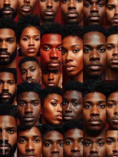 Abstract red theme collage of diverse inclusive human man faces art design illustration from Generative AI