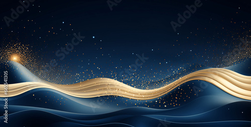 Abstract rendering of high-tech structure, main visual background of data communication annual conference with blue and gold technology glitter lines