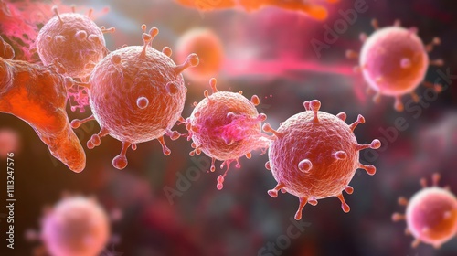 Abstract rendition of viruses attacking cells in a microscopic environment, soft pink and orange hues highlighting the cells, with viruses in dark shadows creating tension,