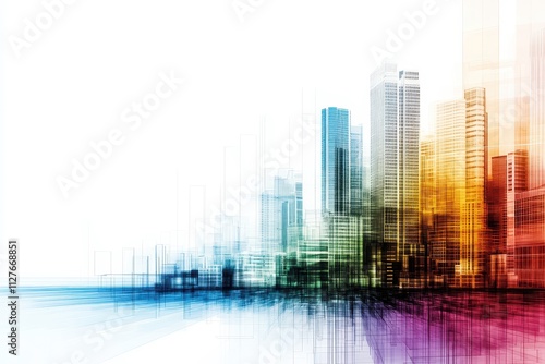 Abstract representation of a vibrant city skyline with colorful reflections and blurred lines, showcasing urban design and modern architecture in a digital art style