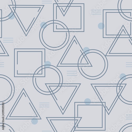 Abstract seamless pattern of geometric shapes with squares, circles and triangles on a gray background
