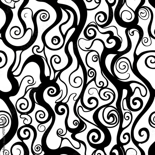 abstract, seamless, pattern, swirling, black, white, line, organic, root, vine, curve, spiral, swirl, design, texture, background, art, graphic, illustration, monochrome, elegant, intricate, detailed, repeating, wallpaper, textile, fabric, print, style, vector, modern, contemporary, decorative, whimsical, flowing, dynamic, fluid, movement, energy, nature, fantasy, dark, light, contrast, bold, simple, complex