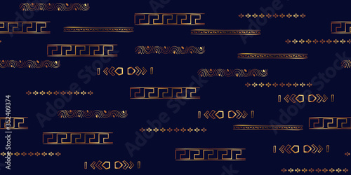 Abstract shapes geometric pattern with lines. Simple graphic print. A seamless vector background. Dark and gold texture.