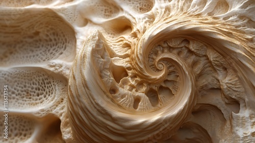 spiral, shell, organic, texture, form, abstract, beige, brown, cream, white, swirl, curve, layer, fold, pattern, detail, surface, structure, natural, art, design, background, image, photo, illustration, graphic, digital, fractal, geometric, elegant, sophisticated, intricate, complex, smooth, rough, porous, hole, cavity, light, shadow, depth, contrast, visual, aesthetic, beauty, captivating