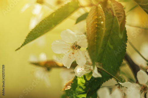 Abstract spring seasonal background of blooming white cherry. The season of the arrival of spring and warmth. Template for design. Copy space.