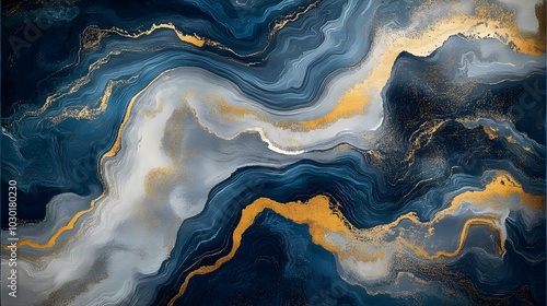 Abstract swirling blue and gold paint creates a mesmerizing, elegant design.