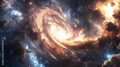 Abstract swirling celestial artwork depicting a vibrant cosmic dreamscape with dynamic energy and flowing colors. Cosmic - Galaxy. Illustration