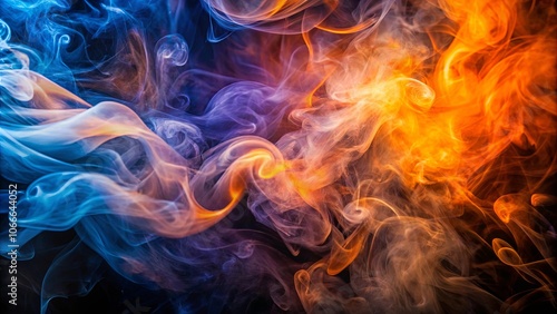 Abstract swirling ethereal smoke in contrasting hues of blue and orange against a dark background.