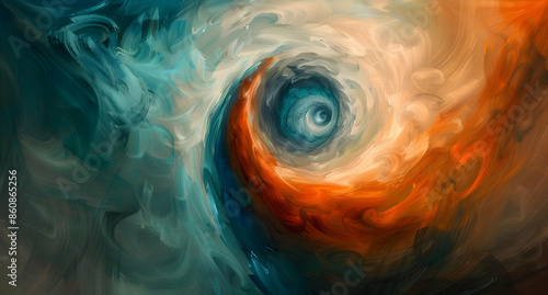 Abstract swirling pattern of blue, orange, and white colors with a dark center. A cosmic nebula or vortex. Digital art.