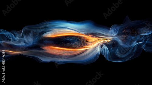 Abstract swirling smoke in shades of blue and orange against a black background. Wisp. Illustration