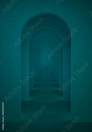 Abstract teal green surreal 3d render. Arch corridor teal green background.