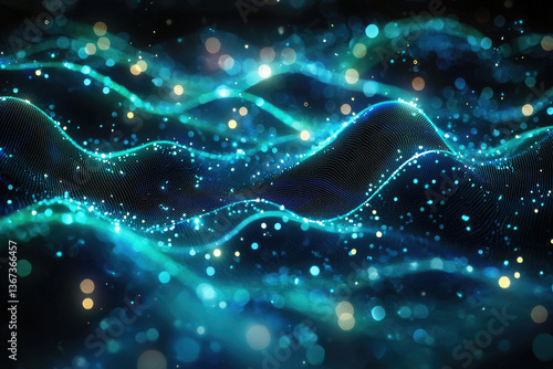 abstract, teal, wave, particle, glowing, energy, light, digital artwork, bokeh, background, texture, motion, flow, dynamic, vibrant, futuristic, technology, science, cosmos, space, universe, sparkle, glistering, shiny, bright, dark, night, blue, green, gradient, pattern, design, illustration, three-dimensional, render, graphic, artwork, visual