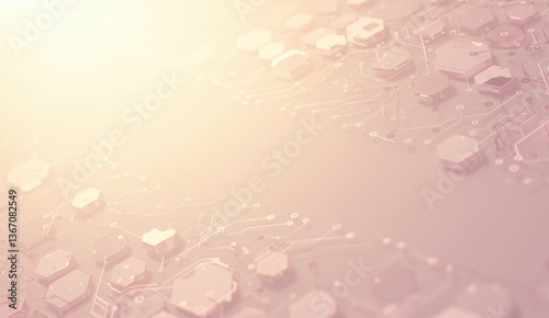 Abstract technology background featuring circuit board with hexagonal shapes and soft pink lighting conveying innovation.