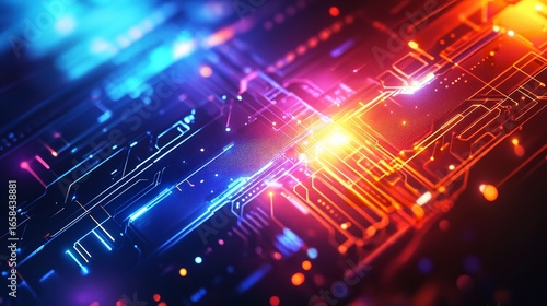 Abstract technology background featuring glowing circuit board design with red and blue lights