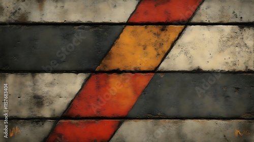 abstract, textured, block, diagonal, colours, stripes, red, orange, yellow, beige, grey, black, brown, grunge, paint, artistic, background, design, pattern, surface, wall, art, texture, style, modern, contemporary, rustic, industrial, vintage, retro, weathered, aged, faded, mottled, rough, coarse, painted, layered, line, geometric, composition, visual, image, graphic