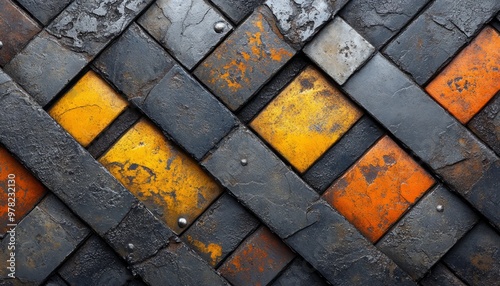 Abstract Textured Metal Surface with Interlocking Diamond Shapes in Black, Yellow, and Orange