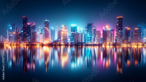 abstract ultra modern light effect of cityscape featuring sleek modern architecture illuminated by vibrant neon lights, Vibrant Futuristic City Skyline at Night with shiny and glowing neon lights.