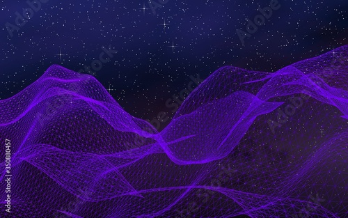 Abstract ultraviolet landscape on a dark background. Purple cyberspace grid. hi tech network. Outer space. Violet starry outer space texture. 3D illustration