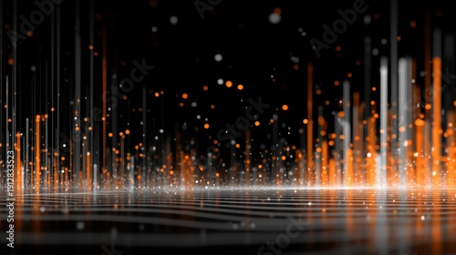 Abstract vertical glowing lines and floating dots rising from dark grid surface for futuristic data visualization and digital infrastructure. Illustrates immersive virtual cityscape, skyscraper
