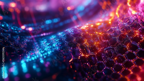 Abstract vibrant glowing hexagonal cellular structure with neon colors, digital art, futuristic, technology, energy, light, network,