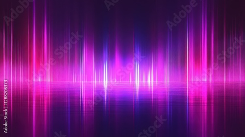 Abstract vibrant neon light beams reflecting on a dark surface.