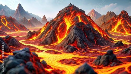 Abstract Volcanic Landscape: Fiery Lava Flow and Dark Orange Mountains